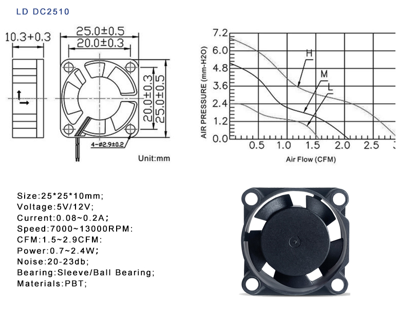 LD2510 5V Sleeve bearing Mini Silent Cooling Fan Products ,PBT,13000RPM,5V,2.9CFM,0.2A,30db,25*25*10mm. Use for Car Light , Raspberry Pi, development board, mini PC, Cooling Fan.