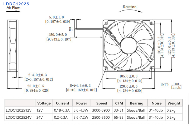 The design of LDDC12025: dimensions are 120*120*25mm; voltage: 12V/24V; current: 0.18~0.30A; bearings: sleeve/ball bearing.