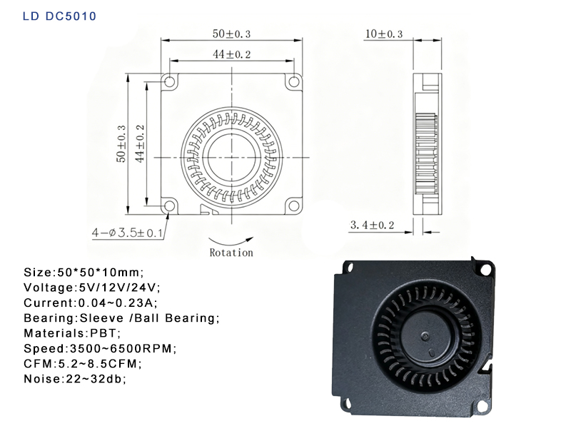 LDDC5010 Blower It is a 50×50×10mm ultra-thin DC blower / axial fan, featuring a small size, high static pressure, and low noise, primarily designed for forced cooling of micro devices. The following explains its specifications, uses, design highlights, popular models from leading brands, and applications.