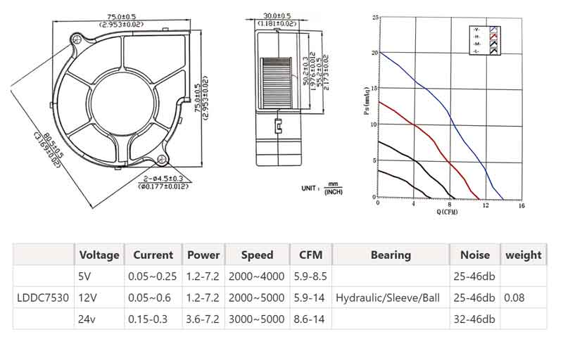 LDDC7530 centrifugal cooling fan, specifically designed for Smart Home Appliance Product Cooling Fan.DC7530 Blower Design Dimensions 75*75*30mm,Voltage 5V/12V/24V, Bearing:Hydraulic/Sleeve/Ball Bearings,Service life: 30000 to 200,000 hours.
