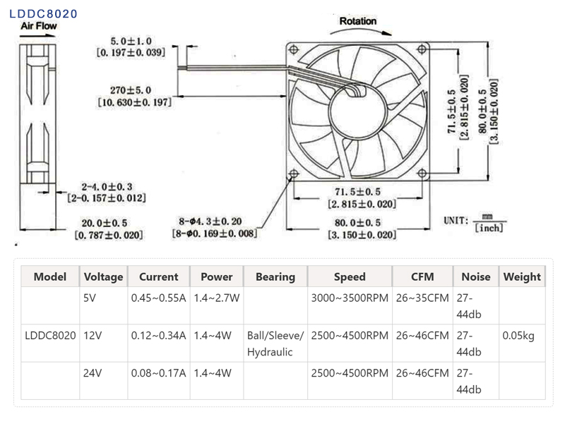 LD Customized DC8020 Cooling Fan ,The core design of the cooling fan focuses on balancing and optimizing performance, reliability, noise, and energy efficiency across four key dimensions: