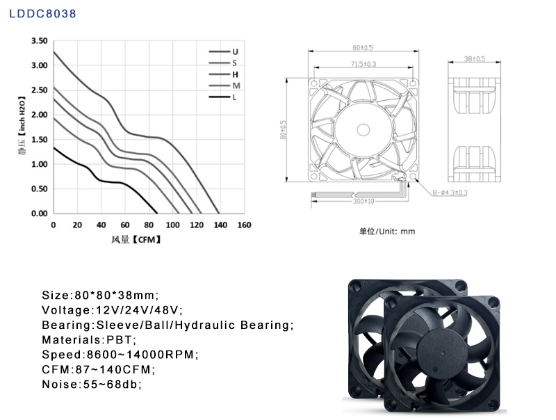 LD Customized DC8038 12V/24V/48V, Fan is one of the most commonly used cooling fans in the industrial and commercial fields. Its design size is 80 * 80 * 38mm, belonging to a large-sized booster fan, suitable for high impedance air ducts, equipped with PWM speed regulation, FG speed monitoring, RD fault alarm, to achieve intelligent operation and maintenance.