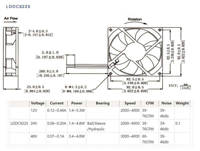 LDDC9225 DC brushless axial cooling fans are standard products widely used in the industrial and consumer electronics sectors.24V is the most commonly used voltage in the industrial sector, while 12V is more commonly found in consumer electronics