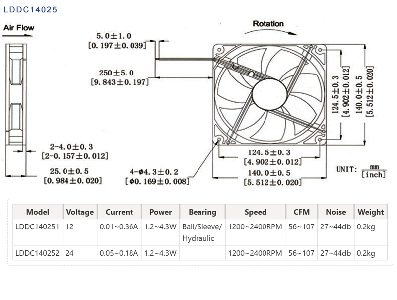 LDDC14025 As a standard 140mm×140mm×25mm product, the cooling fan has become the mainstream choice for electronic device cooling due to its efficient heat dissipation, moderate size, and good compatibility. The design needs to balance four core elements: aerodynamic efficiency, noise control, long lifespan, and intelligent control, while also meeting the special requirements of different application scenarios (such as IP protection, wide temperature range, and anti-electromagnetic interference).